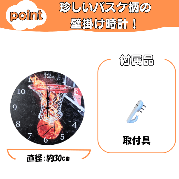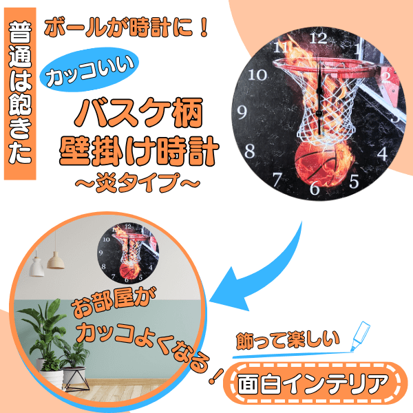 カッコいいバスケ柄壁掛け時計 炎タイプ