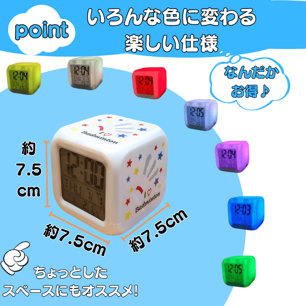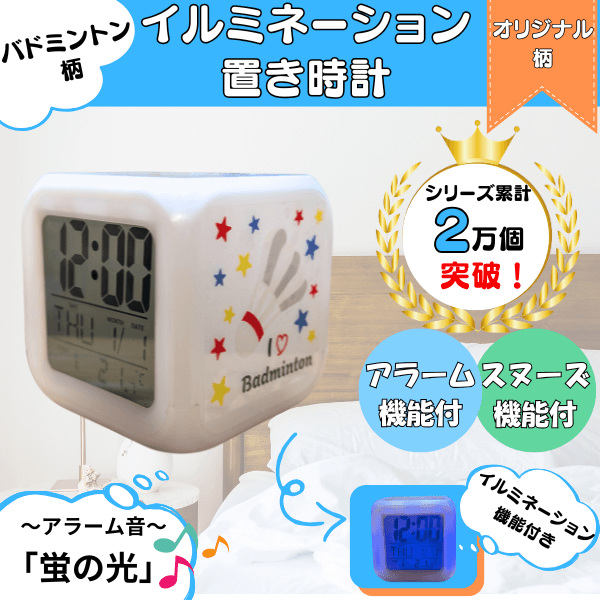 イルミネーション置き時計 ポップなバドミントン柄 (スヌーズ機能付き)
